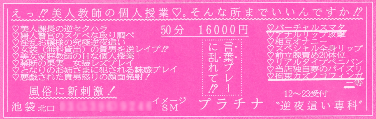 プラチナ。イメクラ系の王道。豊富な妄想シチュエーションのメニューから、お客は好みのプレイを選択できる。「淫乱お嬢様の究極逆夜這い」なんて、言葉尻は完全に妄想の世界に陥っているが、女の子の出張プレイだと思われる。バーチャルスマタというのは、単にスマタのことであって、騎乗位で女の子が男性のペニスを股にはさんで本番さながら…が体験できる。拘束カズノコフィンガーは、男性が拘束され、いろいろなモノでさわられるというプレイ。たっぷり50分16,000円。