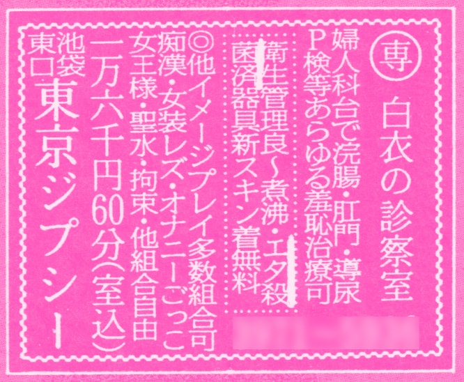 白衣の診察室。こちらもイメクラ系。医療プレイ専門店。婦人科台で浣腸・肛門・導尿P検といった羞恥治療プレイが激しい。エタ殺菌済とは、衛生上、使用する器具はエタノールで殺菌していますという意。たっぷり60分で16,000円。
