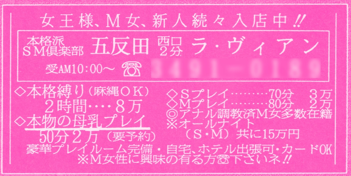 五反田のラ・ヴィアン。これも同じイメクラ系のSMクラブ。本格派だそう。ややお高い料金で、プレイの執拗度も高そうだ。自宅・ホテル出張可。本格縛りが2時間、なんと80,000円。Sプレイ70分で30,000円。Mプレイ80分で20,000円。Mプレイのほうが若干時間が長くて安め、というのはなんとなくわかる。本物の母乳プレイは要予約制で50分20,000円。