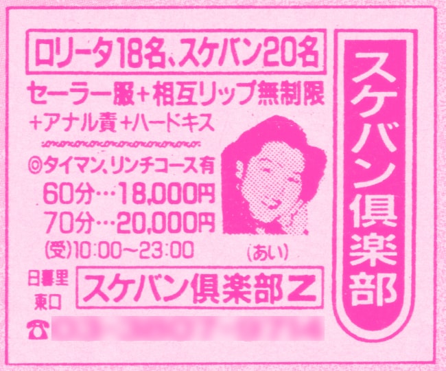 日暮里のスケバン倶楽部Z。スケバン専科といったところ。これはなかなかマニアックなイメクラ系。女の子はセーラー服姿で相互リップ無制限でアナルも責められ、ハードキスの攻勢。かなりきつそうなプレイ。相互リップとは、69のこと。タイマン、リンチコース有で、60分18,000円、70分で20,000円。