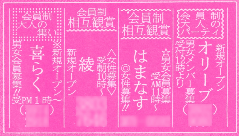 オリーブ、はまなす、綾、喜らく。会員制大人の集いだとか、会員制大人のパーティなどとあって、こちらは比較的穏やかな大人向けのサークルか? と思うかもしれないが、とんでもない、乱交パーティーである。以前はビデオ鑑賞会と称していたらしいが、摘発されたので、名称を変えたらしい。