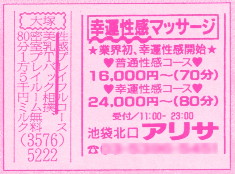 池袋のアリサ。マッサージ系。業界初、とあるが、何が業界初なのか? 幸運性感マッサージというのは、要するに本番のこと。普通性感コースは70分で16,000円~。幸運性感コースは80分で24,000円~。となりの大塚のほうに、美乳Tバック相撲とあるが、これは、Tバックを穿いた女の子と相撲を取るプレイ。