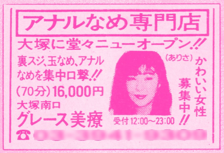 大塚のグレース美療。アナルなめ専門店。これも性感マッサージの一系統。裏スジ、玉なめ、アナルなめ集中口撃。需要がとても増えていたらしい。