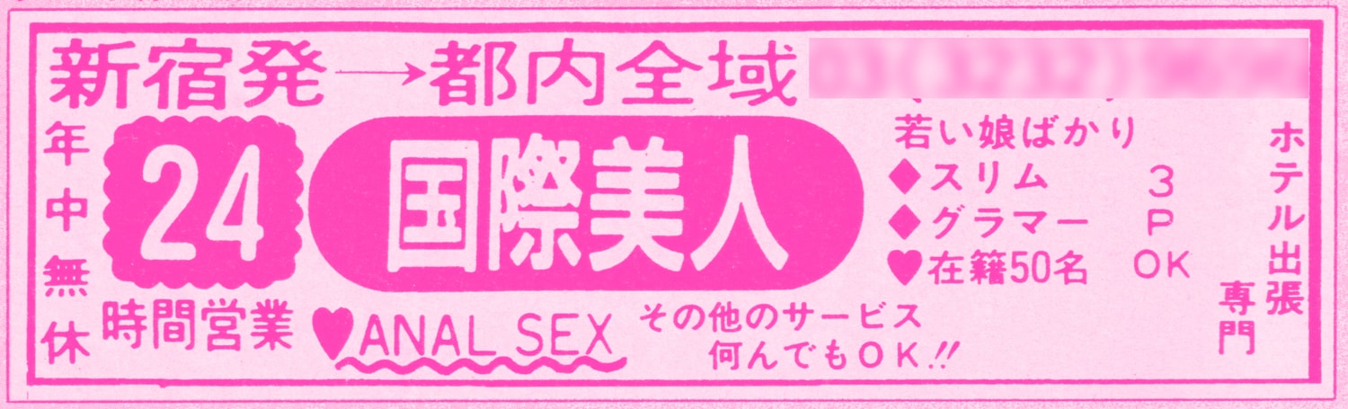 新宿の国際美人。24時間営業のホテル出張専門。若い娘ばかりで、スリム、グラマー、50名ほど。3POKとも。アナルセックスでもなんでもOK。