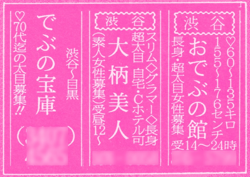 渋谷のおでぶの館。渋谷の大柄美人。渋谷~目黒のでぶの宝庫。要するに太め系の女の子でホテル、自宅出張。でぶの宝庫さんでは、70代までの太めさんを募集していたらしい。はて、需要があったのかどうか。