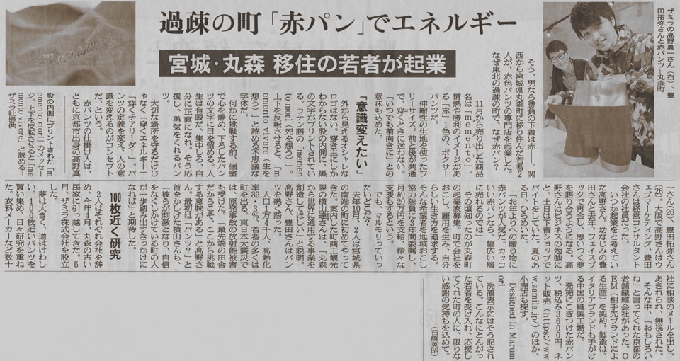 製作したのは、丸森町で会社を設立したザミラ株式会社(代表取締役は高野真一さん)。何やら記事を読むと、この赤パンには、股の内側に奇妙な文字のプリントが施されているのだという。ラテン語の「memento mori」。上下を反転させれば、その文字が「memento vivere」に。日本語に訳すと、“死を想う”が“生を想う”になる――? いったい何なんだ、この赤パンは――。